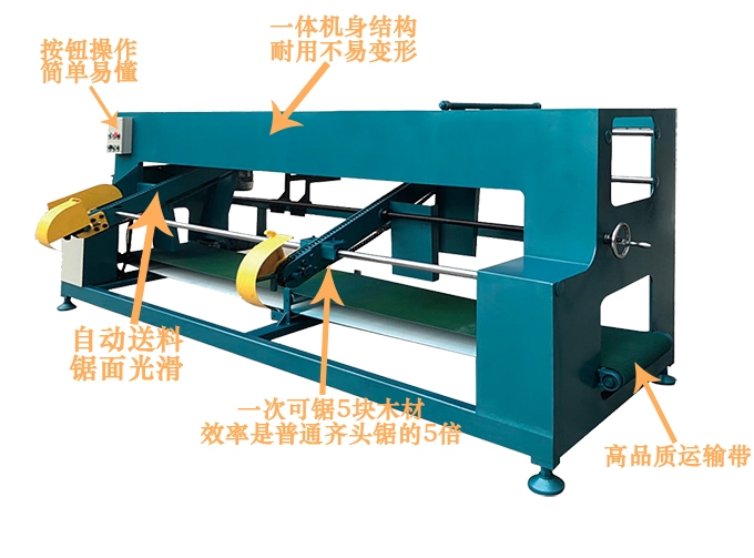 全自動高速齊頭鋸一體式機身設計、采用國標鋼材、結構科學、操作簡單、鋸面光滑、誤差小、效率高、故障率低、速度可調,一次可以鋸五塊木板,最短1米,最長2.2米,中間尺寸可隨意調節